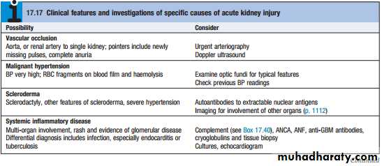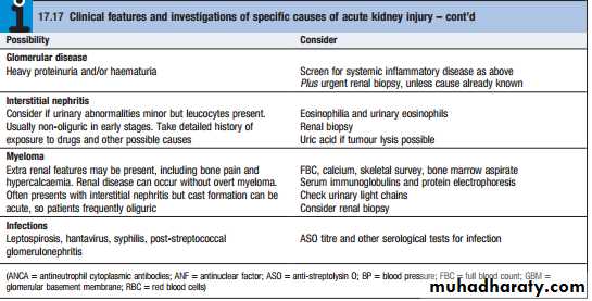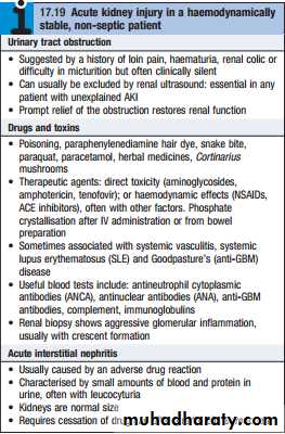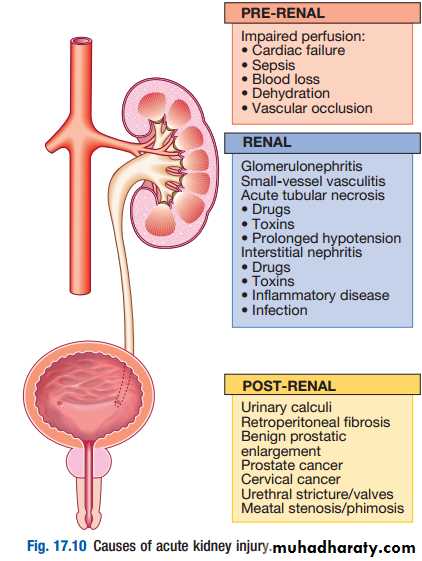 In prerenal AKI, the kidney becomes damaged as the result of hypoperfusion, leading to acute tubular necrosis. Renal AKI may be caused by nephrotoxic drugs which can cause acute tubular necrosis and a similar histological picture to prerenal AKI or interstitial nephritis.The other common cause is glomerulonephritis, in which there is direct inflammatory damage to the glomeruli . Postrenal AKI occurs as the result of obstruction to the renal tract, with kidney damage arising as the result of back pressure..Clinical features