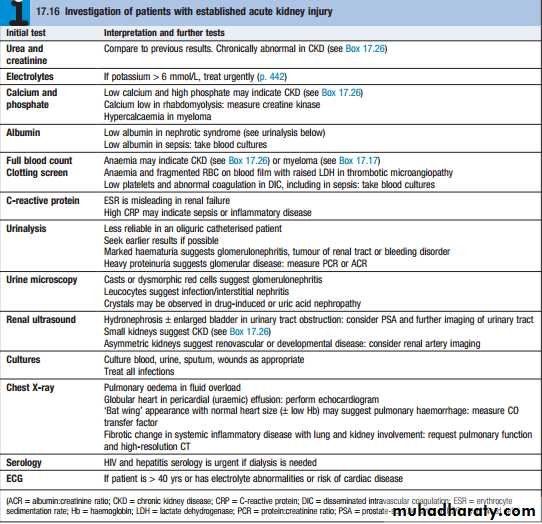Early recognition and intervention is important in AKI; all emergency admissions to hospital should have renal function, blood pressure, temperature and pulse checkedon arrival and should undergo a risk assessment for the likelihood of developing AKI. This includes looking at coexisting diseases such as diabetes, vascular disease and liver disease, which make AKI more likely, as well as gathering information on drug treatments such as ACE inhibitors and NSAIDs, which may be associated with renal dysfunction. If a patient is found to have a high serum creatinine, it is important to establish whether this is an acute or acuteonchronic phenomenon, or a sign of chronic kidney disease. Previous measurements of renal function can be of great value in differentiating these possibilities.Pre-renal AKI
