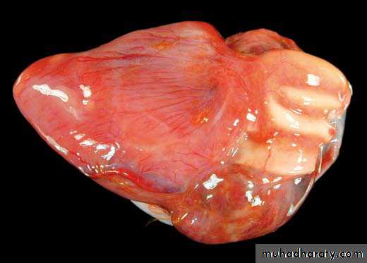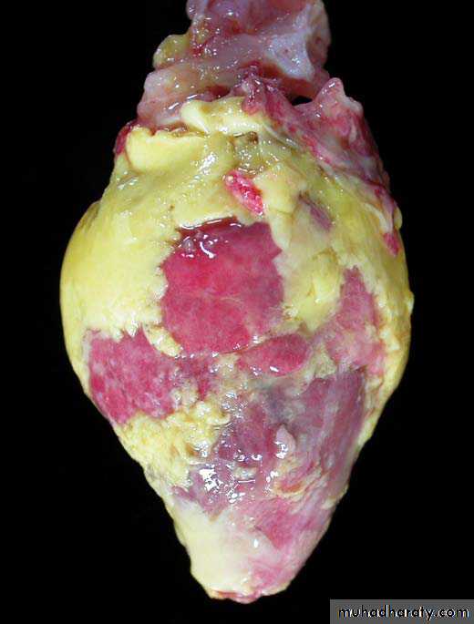 it is an inflammation of the serous membranes surrounding the heart and forming the pericardium sac. This lesion is characterised by the presence of exudate, usually fibrinous or fibrino-purulent, in the pericardial cavity or on the surface of the visceral pericardium (fig. 4). This lesion is frequent in animals suffering from septicaemia, usually due to Escherichia coli. It is normal to observe perihepatitis and airsacculitis (polyserositis) in addition to pericarditis (fig. 5).Fig. 4 Fibrinous pericarditis showing the presence of fibrinous exudate on the