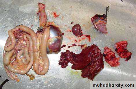 • Like the thymus, a change in size is the most common gross alteration to be observed. An increase in the relative size of the spleen, known as splenomegaly, is normal as a primary response to circulating antigen. This size increase is usually accompanied by military white spots seen both on the organ surface as well as at the section (fig. 3). This lesion is often observed in animals suffering from septicaemia, mainly due to Escherichia coli. Inflammation of the spleen, known as splenitis, is quite rare.Fig. 3 Splenomegaly in a bird affected by colisepticaemia.