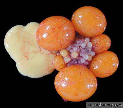 Fig. 8 Functional ovary of a 35 week old hen. Six large yellow follicles are seen alongside one atretic follicle. This has lost its turgor and displays a paler colour.