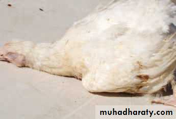 Botulism is a poisoning causing by eating spoiled food containing a neurotoxin produced by the bacterium Clostridium botulinum. Paralysis, the most common clinical sign, occurs within a few hours after poisoned food is eaten.In chickens, flaccid paralysis of legs, wings, neck, and eyelids are predominant features of the disease. Paralytic signs progress cranially from the legs to include wings, neck, and eyelids. Initially, affected birds are found sitting and are reluctant to move. Wings droop when paralyzed. Limberneck, the original and common name for botulism. Because of eyelid paralysis, birds appear comatose and may seem dead. Gasping has been reported when birds are handled. Death results from cardiac and respiratory failure. Affected chickens have ruffled feathers. Broiler chickens showing signs of botulism may have diarrhea with excess urates in the loose droppings.