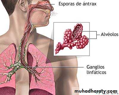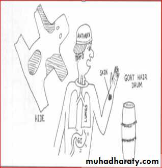 2- SkinHumans are exposed to the spores during direct contact with infected animals or soil, or when handling infected animal products, such as hides or wool through injured skin (cutaneous anthrax).3-Respiratory trat by inhalation of spores into lung