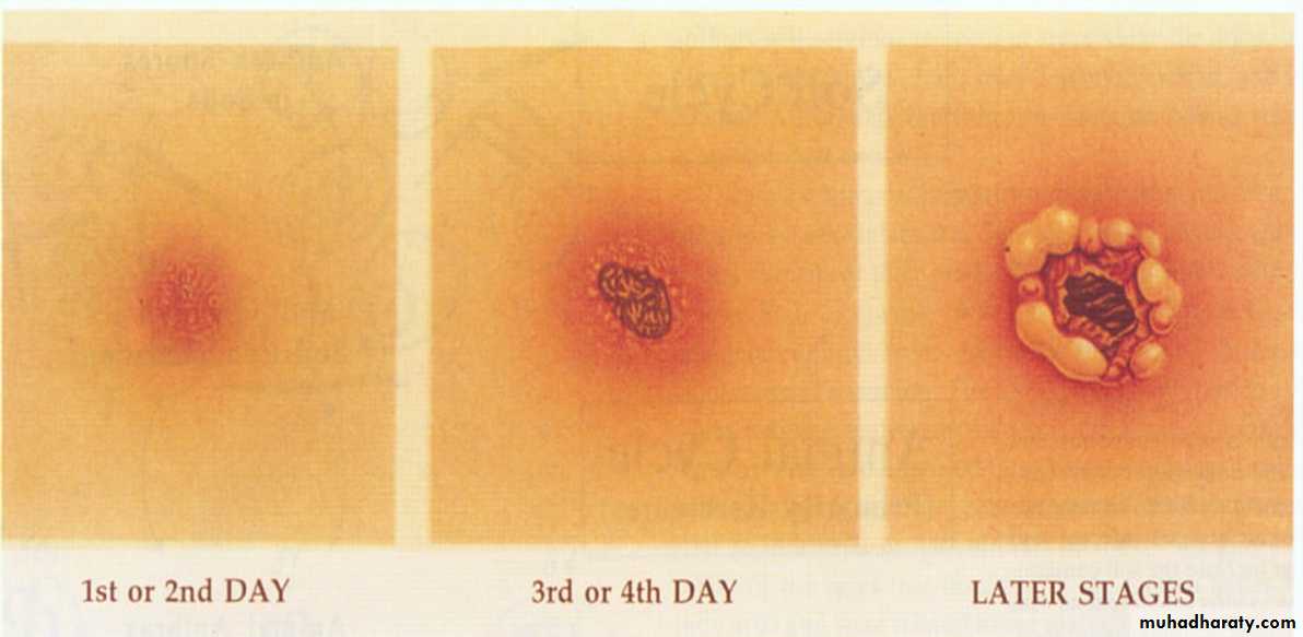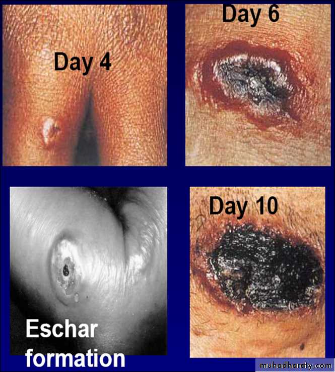 Papule – vesicle – pustular – centrally necrosed – black coloration.
