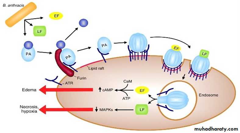 After invading blood circulation release of exotoxin is the major reason why anthrax carries such a high mortality rate. These toxins are encoded on a plasmid.The exotoxin contains 3 separate proteins, which by themselves are nontoxic