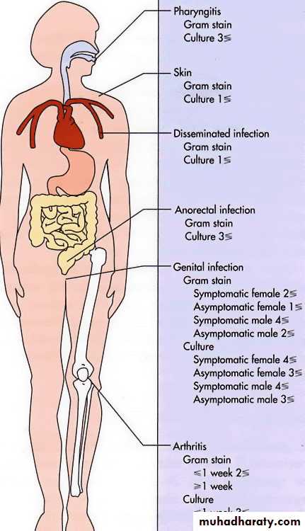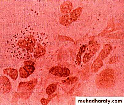 Gram-stained smears (of urethral exudate from men and the cervix in women) usually reveal Gram negative, kidney-shaped intracellular cocci in pairs