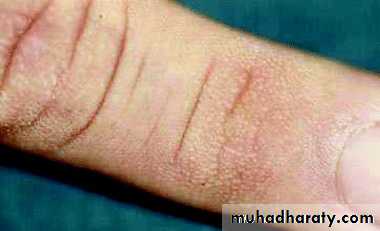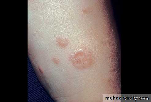 These are yellow, 1- to 4-mm papules with a red halo around the base.They appear suddenly in crops on extensor surfaces of the arms, legs, and buttocks and over pressure points.