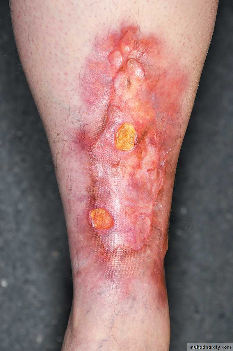 They are tense, and spontaneously rupture in 1 week leaving a painless ulcer (that is difficult to heal) with firmly adherent crust.