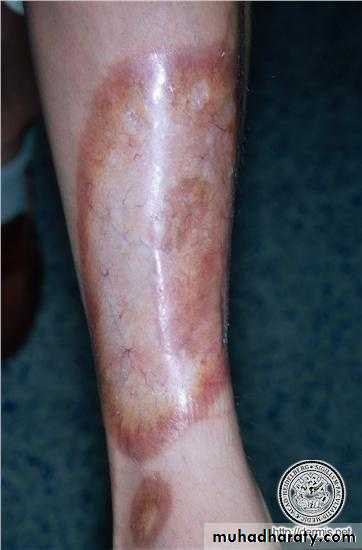 They begin as round-to-oval, flat topped, red, scaly papules that may become eroded. They eventually clear or heal with atrophy and hyperpigmentation.Shin spots may also occur on forearms, anterior lower thighs, and sides of feet.