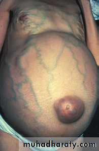 is accumulation of free fluid in the peritoneal cavity. Small amounts of ascites are asymptomatic, but with larger accumulations of fluid (> 1 L) there is abdominal distension, fullness in the flanks, shifting dullness on percussion and, when the ascites is marked, a fluid thrill.Other features include eversion of the umbilicus, herniae, abdominal striae, divarication of the recti and scrotal edema. Dilated superficial abdominal veins may be seen if the ascites is due to portal hypertension.