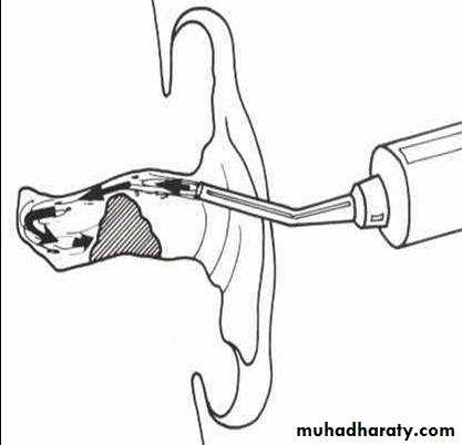 Suction through the operating microscope when a perforation in the tympanic membrane is present or in previous ear surgery. If the wax is hard then preliminary softening by the use of repeated instillation of 5% sodium bicarbonate in glycerin, olive oil or diluted hydrogen peroxide.