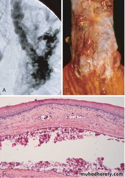 development of a congested subepithelial and submucosal venous plexus within the distal esophagus. These vessels, termed varices,develop in 90% of cirrhotic patients, most commonly in association with alcoholic liver disease. Hepatic schistosomiasis is the second most common cause of varices.