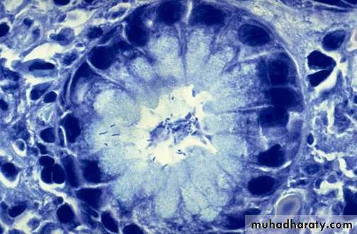H-pylori This small curved to spiral rod-shaped bacterium is found in the surface epithelium of most patients with active gastritis. The rods are seen here with a methylene blue stain.
