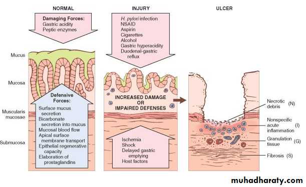 The imbalances of mucosal defenses and damaging forces that cause chronic gastritis are also responsible for PUD