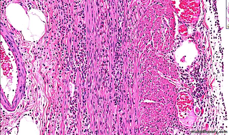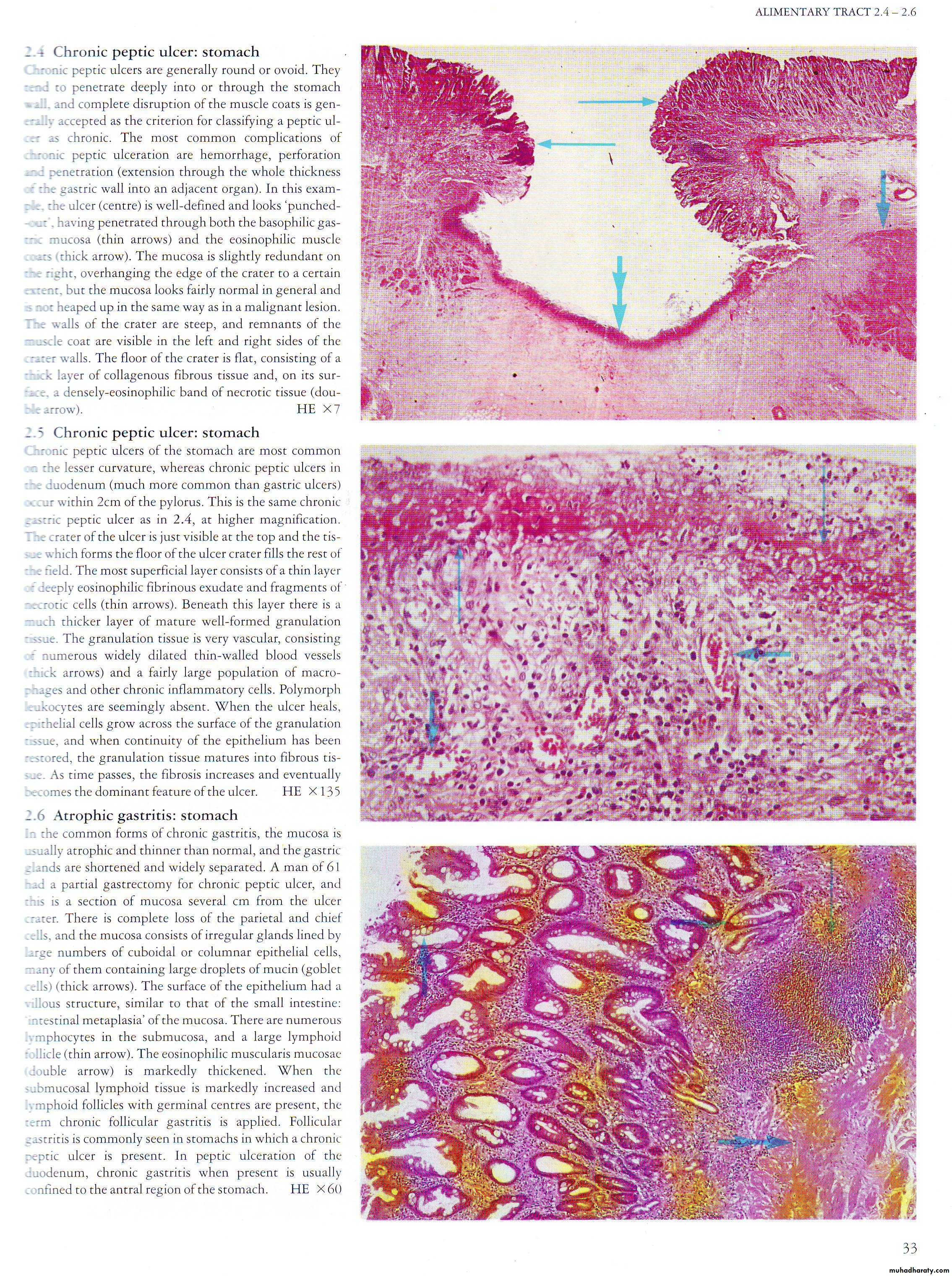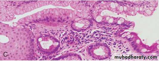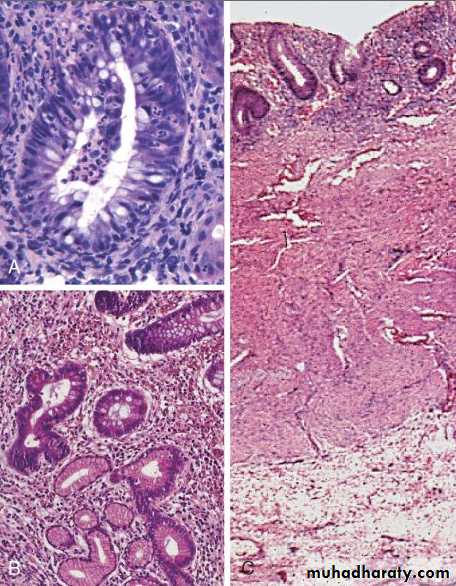 Mild condition show neutrophils infiltrated the surface epithelium & glands in lamina propria with lymphocytes and plasma chronic inflammatory cellsIn severe cases there are erosion of surface epithelium , ulceration , bleeding and hemorrhage.