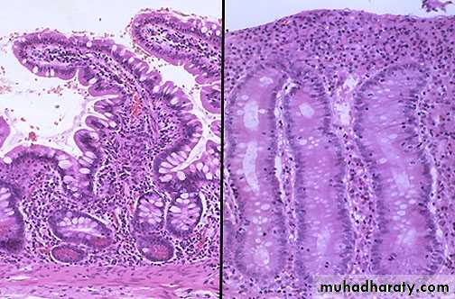 • The histopathology is characterized by increased numbers of intraepithelial CD8+ T lymphocytes (intraepithelial lymphocytosis), crypt hyperplasia, and villous atrophy .