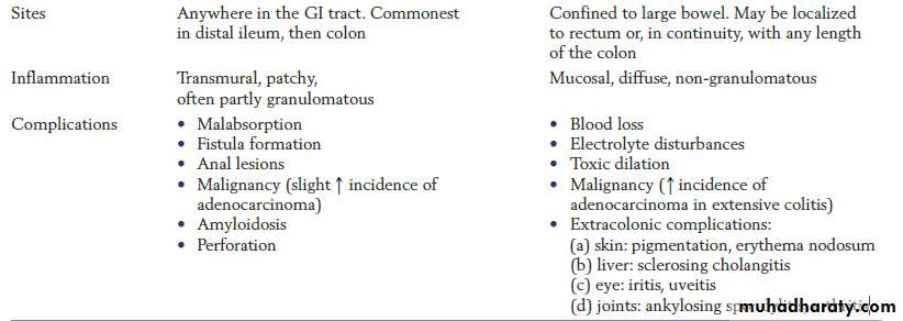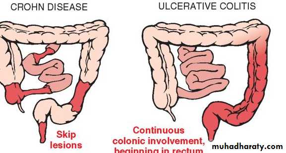 Crohn disease : affecting the small & large intestine ( oral to anus) mainly ileocecal regionUlcerative Colitis : only large intestine, sigmoid region