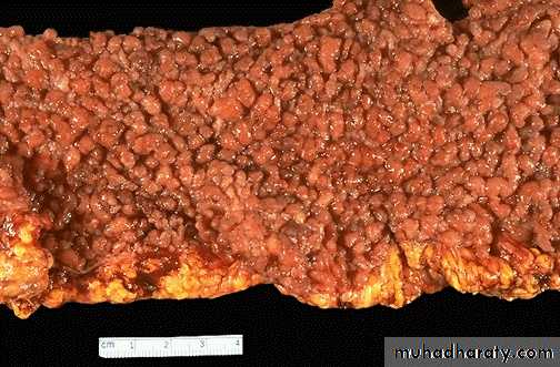 tubular crypts arising from a lobulated surfaceThe villous adenoma : less common type has a small intestine like velvety surface made up of numerous epithelial-lined projections .