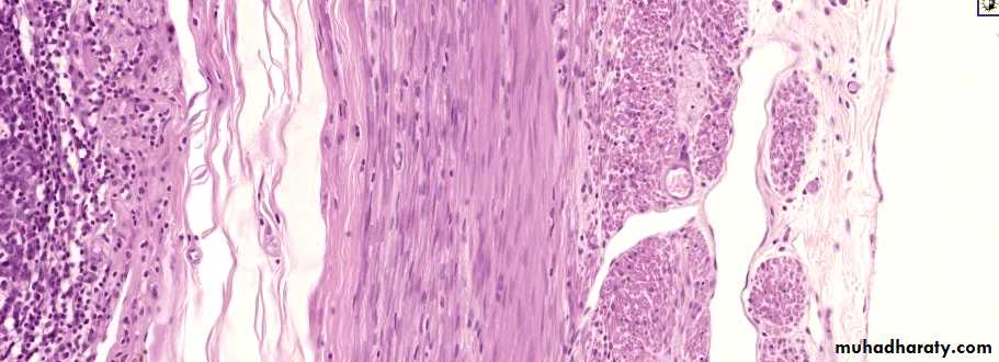 Microscopically, the disease is characterized by a reduction in the numbers of neurones in the muscular (myenteric) plexus of the lower oesophagus, dilatation of proximal esophagus ,Inflammation &ulceration of mucosa .
