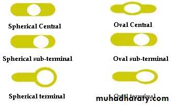 The shape & position of spores varies in different spp. & thus useful in their identification. Spores may be;Central or equatorial in Cl.bifermentans(Spindle shaped)