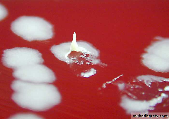 Colonial growth of Bacillus anthracis. When lifted by an inoculation loop, colonies, in this case on sheep blood agar, show a tenacity that allows them to be pulled up and stay upright with a texture similar to egg whites.
