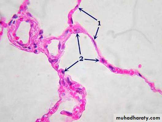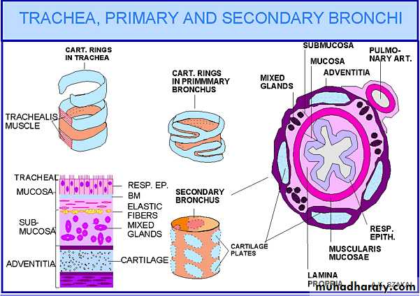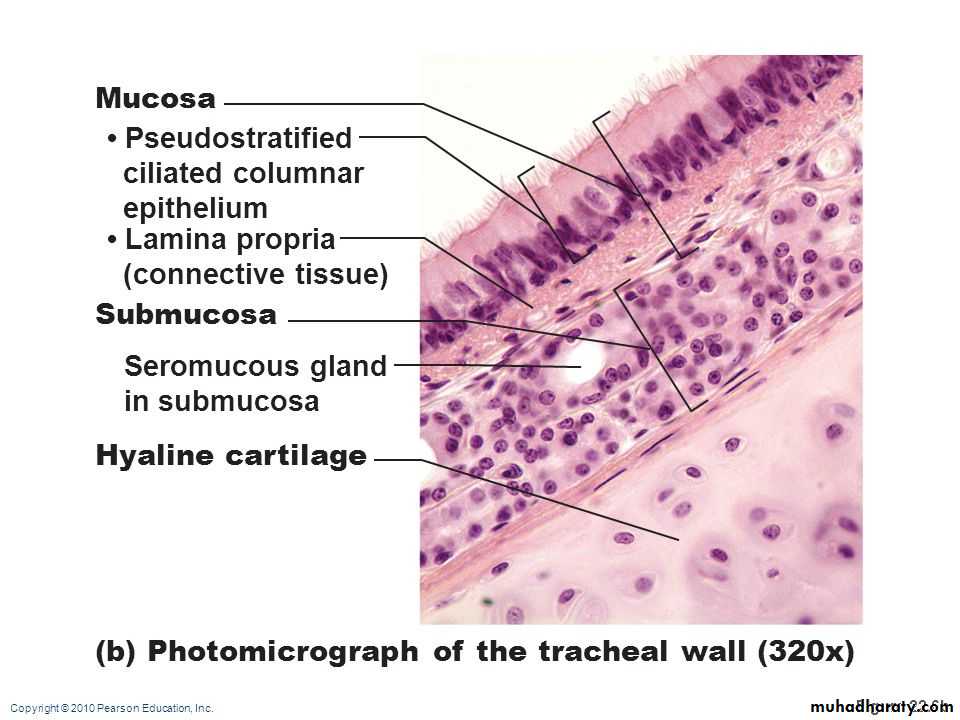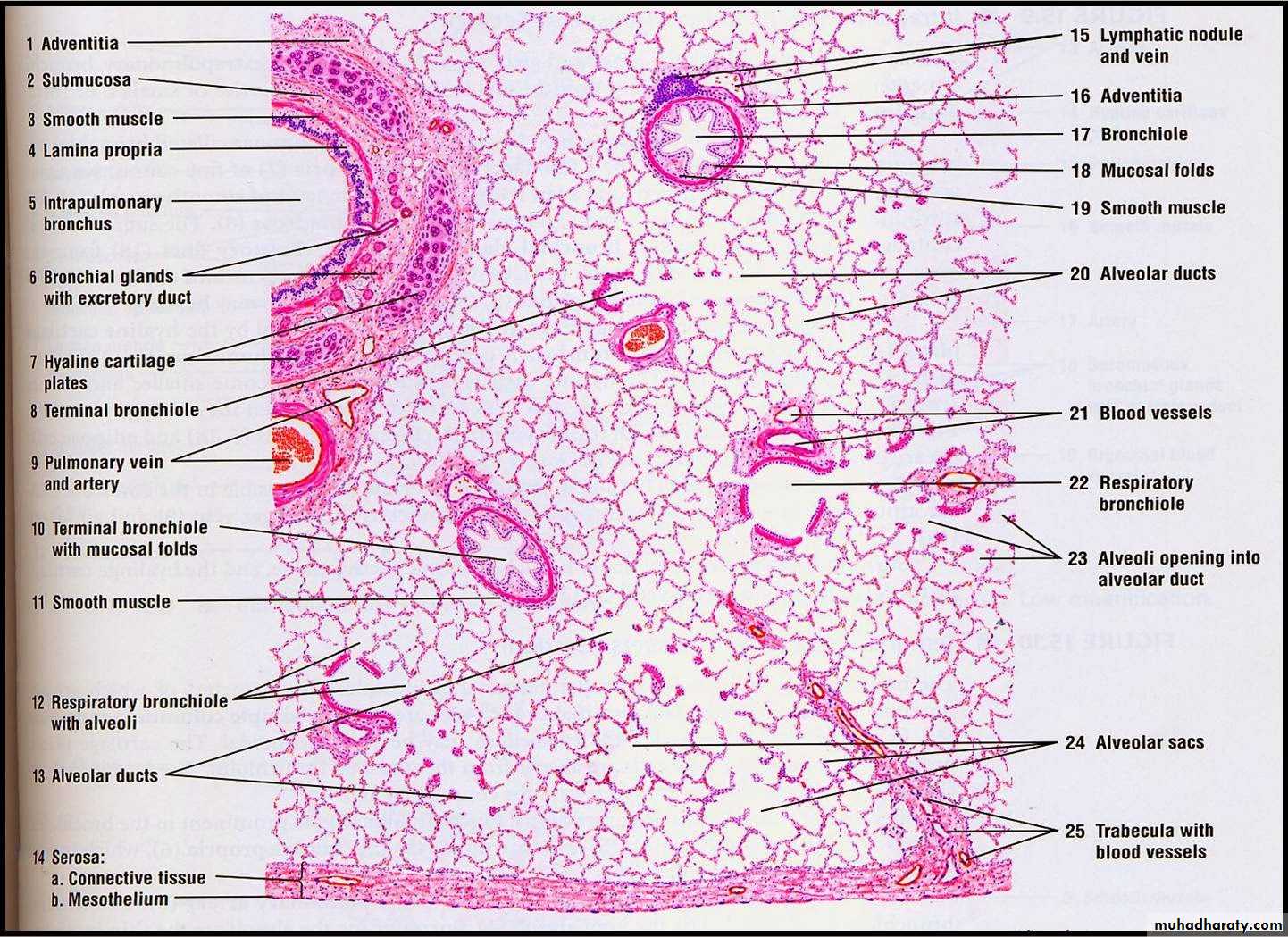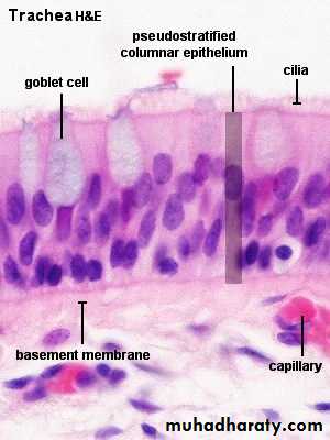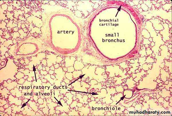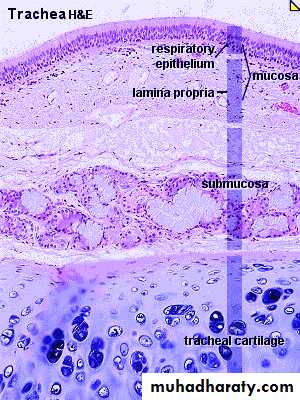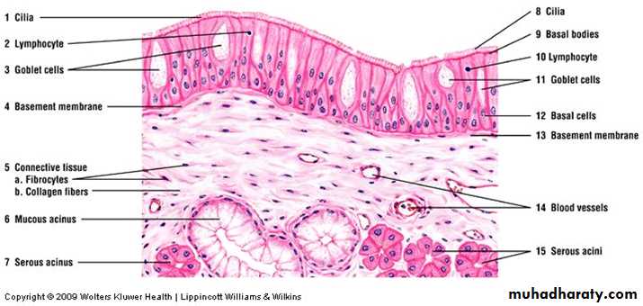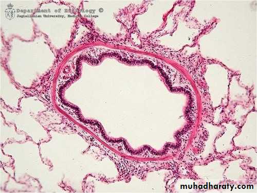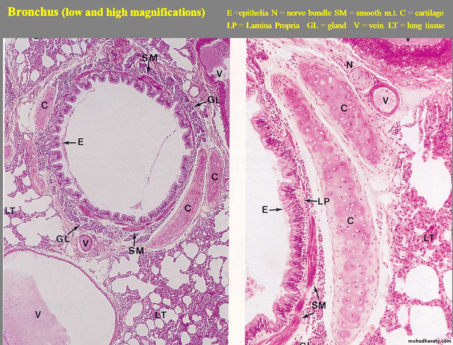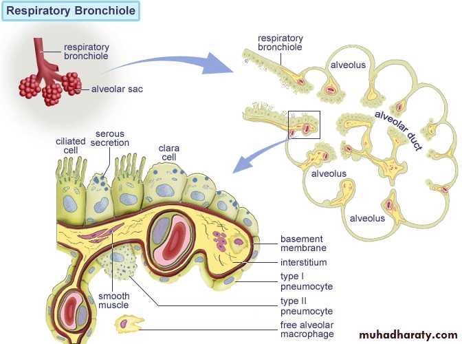 Mucosa: lined by respiratory epithelium with Clara cells replacing goblet cellsEpithelium gradually become mostly clara cells with cuboidal rather than ciliated epithelium as the terminal bronchioles.