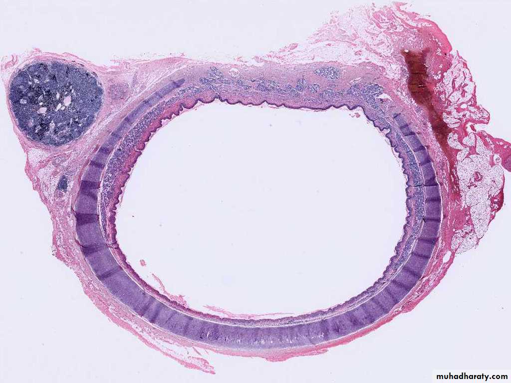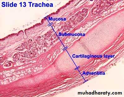 Mucosa: respiratory epithelium as seen in tracheaSmooth muscle band between submucosa and mucosa