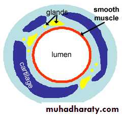 The trachea is a wide flexible tube, the lumen of which is kept open by 20 tracheal cartilages, which are C-shaped rings of hyaline cartilage. The gaps between the rings of cartilage are filled by the trachealis muscle - a bundle of smooth muscle, and fibroelastic tissue (Figs. 1 and 3). Together these hold the lumen of the trachea open, but allow flexibility during inspiration and expiration. The respiratory mucosa and submucosa are adapted to warm and moisten the air, and to trap particles in mucous.The trachea is the largest tube in the respiratory tract and consists of tracheal rings of hyaline cartilage. It branches off into two bronchial tubes, a left and a right main or primary bronchus. The bronchi branch off into smaller sections inside the lungs, called bronchioles. These bronchioles give rise to the air sacs in the lungs called the alveoli. The respiratory tree or trachea-bronchial tree is a term also used to refer to the branching structure of airways supplying air to the lungs and includes the trachea, bronchi and bronchioles. In the tertiary bronchii, there is less cartilage, and it does not completely encircle the lumen, as shown diagramatically above [Fig. 5]. Notice also how the mucosa is folded, and think about how this might change as you breathe in and out.