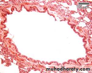 The final branches of the bronchioles are called terminal bronchioles. These have a layer smooth muscle surrounding their lumens [Fig.6a & 6b]. Stimulation of the vagus nerve (parasympathetic) causes the smooth muscle to contract, and reduce the diameter of the terminal bronchioles.Small sacs are found extending from the walls of the terminal bronchii called respiratory bronchioles (R), that are lined by a ciliated cuboidal epithelium, and some non-ciliated cells called clara cells (Fig. 7).
