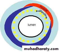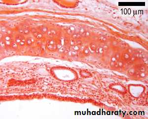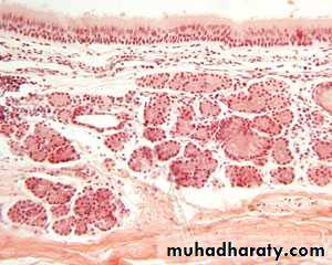 (Fig -4 a&b): (a). A cross section through the trachea, showing the major layers. (b). A higher power image of the trachea showing the glands and epithelium in more detail. Note the numerous sero-mucous glands in the submucosa layer. The layer of cartilage is not seen here, but instead there is a layer of fibro-elastic Co.T. which runs between the rings of cartilage.