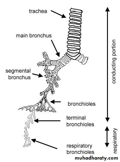 The conducting portion is made up of: (1). nasal cavities; (2). Nasopharynx; (3). Larynx; (4). Trachea; (5). bronchii and (6). bronchioles. The trachea branches to give rise to two primary (main) bronchii. These then branch successively to give rise, in turn, to secondary and tertiary bronchii. These then branch to give rise to several orders of progressively smaller airways called bronchioles, the smallest of which are called terminal bronchioles. These are the last components of the conducting portion of the respiratory system. Terminal bronchioles give rise to respiratory bronchioles, which ultimately lead to the alveoli.The respiratory tract is divided into the upper airways and lower airways. The Upper respiratory tract can refer to the parts of the respiratory system lying above the sternal angle (outside of the thorax), above the vocal folds, or above the cricoid cartilage. The larynx is sometimes included in both the upper and lower airways. The larynx is also called the voice box and has the associated cartilage that produces sound. The tract consists of the nasal cavity and paranasal sinuses, the pharynx (nasopharynx, oropharynx and laryngopharynx) and sometimes includes the larynx. The lower respiratory tract is derived from the developing foregut and consists of the trachea, bronchi (primary, secondary and tertiary), bronchioles (including terminal and respiratory), and lungs (including alveoli) [Fig. 2a & 2b]. It also sometimes includes the larynx. The lungs can be included in the lower respiratory tract or as separate entity and include the respiratory bronchioles, alveolar ducts, alveolar sacs, and alveoli. The respiratory tract can also be divided into a conducting zone and a respiratory zone, based on the distinction of transporting gases versus exchanging them. From the bronchi, the dividing tubes become progressively smaller with an estimated 20 to 23 divisions before ending at an alveolus.
