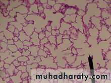 The tertiary bronchii branch into bronchioles, which have a diameter of 1mm or less, and the wall structure changes. The epithelium is made up of ciliated columnar cells in larger bronchioles, or non-ciliated in smaller bronchioles (difficult to see at this magnification). There are no goblet cells, but there are cells called Clara cells. These cells are secretory - they secrete one of the components of surfactant.