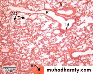 (Fig. 7a&b): A terminal bronchiole (TB) at a lower magnification than the three pictures above. This is the last part of the conducting portion of the respiratory system, and has the smallest diameter of all (less than 1mm). There is no cartilage, or glands, some smooth muscle is still present, there are no goblet cells. The epithelium is either columnar or cuboidal.