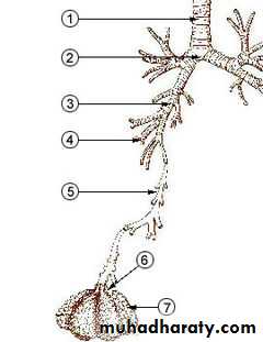 (Fig. 3a & 3b): The respiratory tree: (1). Trachea; (2). Mainstem bronchus; (3). Lobar bronchus; (4). Segmental bronchus; (5). Bronchiole; (6). Alveolar duct and (7). Alveolus