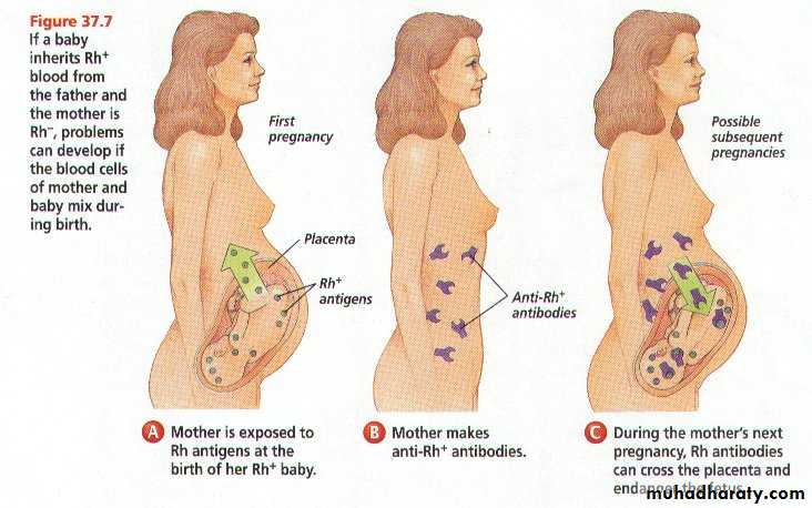 Second pregnancy, if the child is Rh+, the mother’s antibodies can cross the placenta and start to attack the fetus’ blood cells, causing hemolysis.