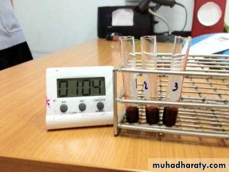 5-at exactly 5 min remove the first tube from water bath and tilt gently to 45⁰ angle to see whether the blood has clotted.