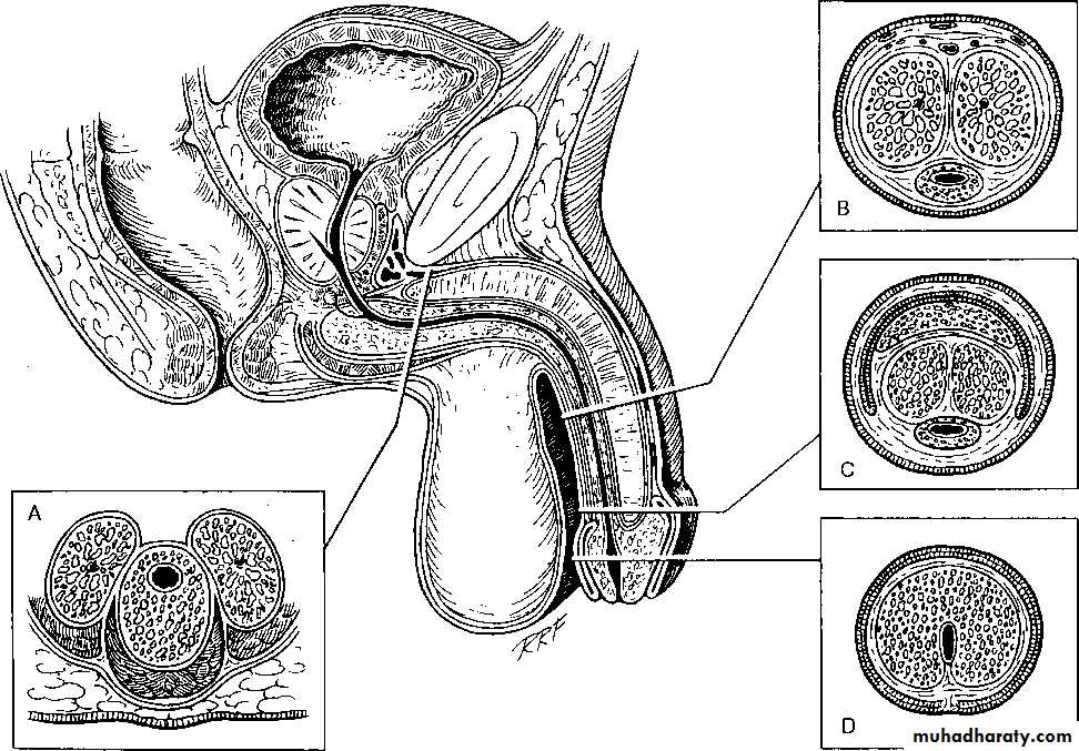 two corpora cavernosa.The distal part of the urethra which passes through the glans penis is named the navicular fossa. The penile urethra ends, is the external urethral meatus.