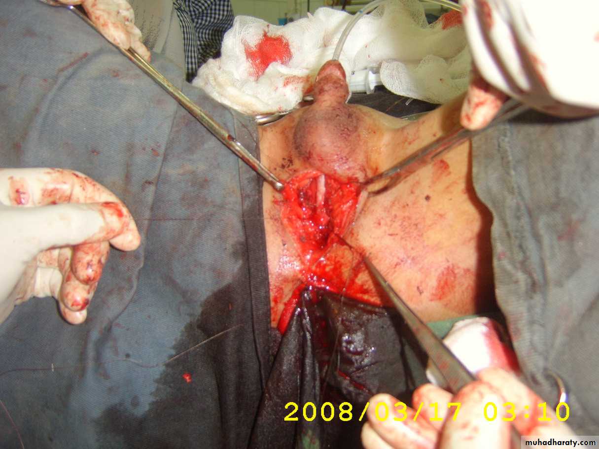 • This is the most severe abnormality. The scrotum is bifid and the urethra opens between its two halves. There may be undescended testes