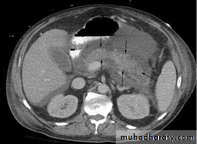 CT for evidence of pancreatic swelling, pancreatic necrosis, abscess or pseudocyst.