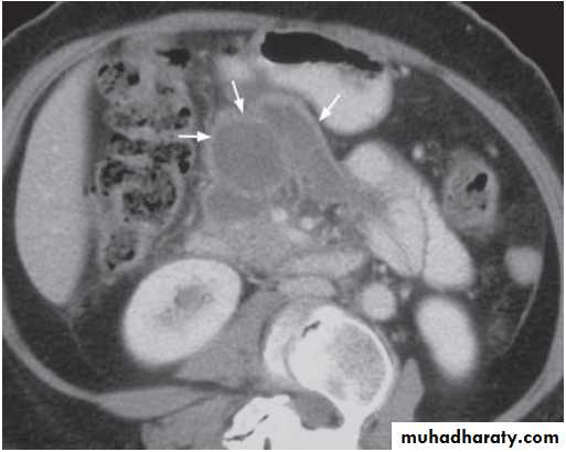 Contrast enhanced axial computed tomography (CT) shows a pancreatic abscess (arrows) appearing as a multiple loculated hypodense lesion with a thick enhancing wall.