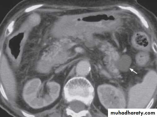 Contrast enhanced axial computed tomography (CT) showing a small pancreatic pseudocyst (arrow) in pancreatic tail in a patient with recent history of pancreatitis.
