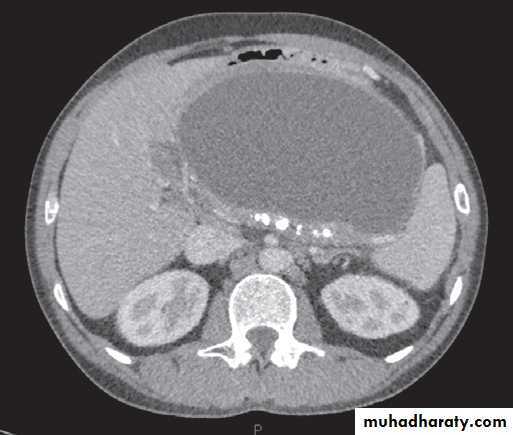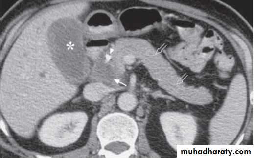 Contrast enhanced axial computed tomography (CT) shows a hypodense tumour in pancreatic head (arrow). The rest of the pancreas appears normal (open arrows). Note the presence of biliary stent (arrowhead) which was inserted to relieve common bile duct obstruction by the tumour. However, the gallbladder (asterisk) remains distended