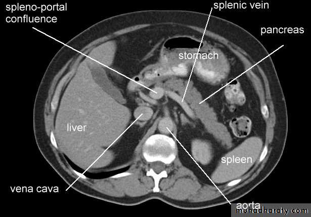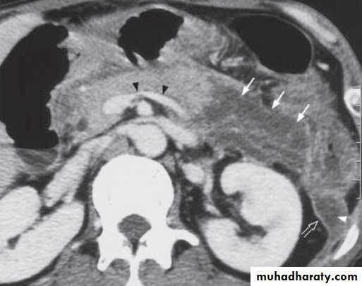Contrast enhanced axial computed tomography (CT) shows non-enhancement of the swollen pancreatic body and tail (arrows) compatible with pancreatic necrosis.