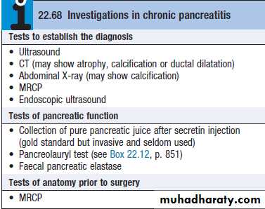 Raised serum amylase or lipase concentrations. A persistently elevated serum amylase concentration suggests pseudocyst formation. Peritoneal amylase concentrations are massively elevated in pancreatic ascites.Ultrasound scanning can confirm the diagnosis (pancreatic swollen), also to show gallstones, biliary obstruction or pseudocyst formation.