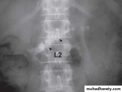Magnified AXR shows a cluster of coarse calcification (arrowheads) along the perceived location of the pancreas (L1 and L2 levels).