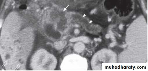 Contrast enhanced axial computed tomography (CT) showing a large necrotic tumour in the pancreatic head (arrow). The pancreatic duct is dilated (arrowheads). Note the presence of multiple small irregular hypodense lesions in right lobe of liver (open arrows) representing liver metastasis.