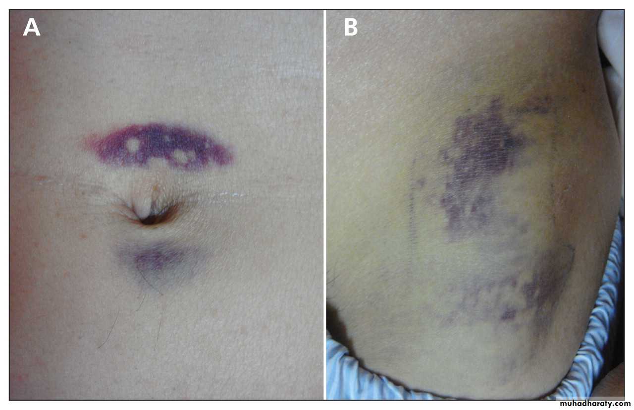 Acute, severe, constant upper abdominal pain, radiates to the back associated with nausea and vomiting. There is epigastric tenderness, but no guarding.Discoloration of the flanks (Grey Turner’s sign) or the periumbilical region (Cullen’s sign) is a feature of severe pancreatitis with haemorrhage.