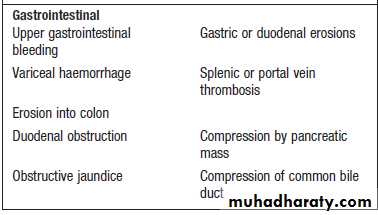 Few patients present with diarrhoea, vomiting from duodenal obstruction, diabetes mellitus, recurrent venous thrombosis, acute pancreatitis or depression.