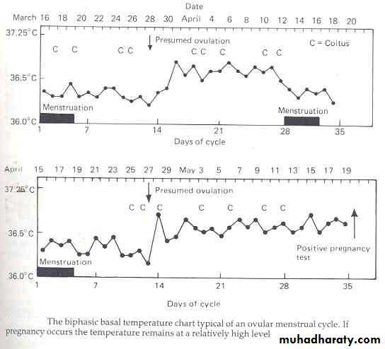 Women take her basal body temperature each day with special thermometer and write it down on a chart. Immediately before ovulation, the temperature drops briefly. Within 12 hours of ovulation the BBT rises slightly, of about 0.5° c due to progestron secretion and this is fertile period in which intercourse encouraged.