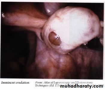 Dominant follicle can be seen and its daily increase in size (about 2 mm/ day). A sudden reduction in size around the expected mid-cycle (from about 20-25 mm) is suggestive of rupture of dominant follicle and release of oocyte occurred. Confirmation of ovulation can only be established with serial scans.Failure of oocyte release known as lutinized unruptured follicle syndrome. It may be treatable by administration of human chorionic gonadotrophin at the right time to mimic LH surge.